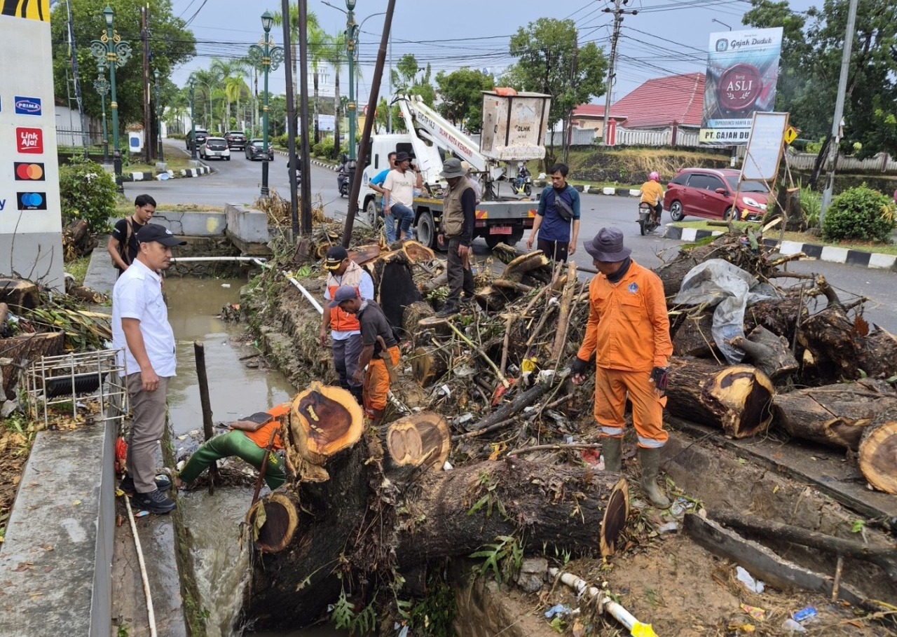Genangan air terjadi setelah material sisa tebangan dan pangkasan pohon menutup aliran drainase, sehingga air tidak dapat mengalir secara optimal saat hujan turun. Kondisi tersebut menyebabkan air meluap dan menggenangi area perkantoran.
