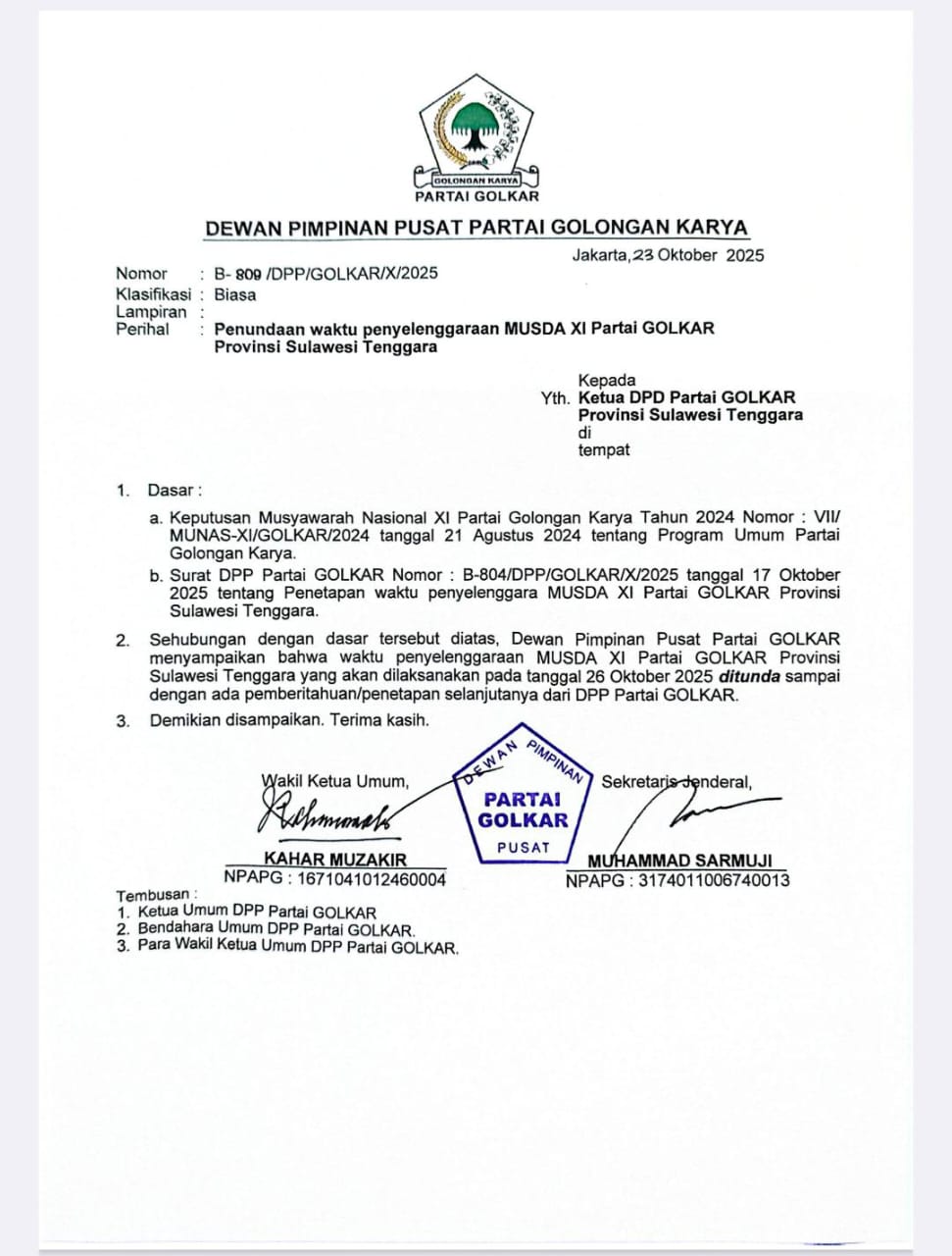Ketgam: Surat penundaan penyelenggaraan Musda ke XI Partai Golkar Sultra