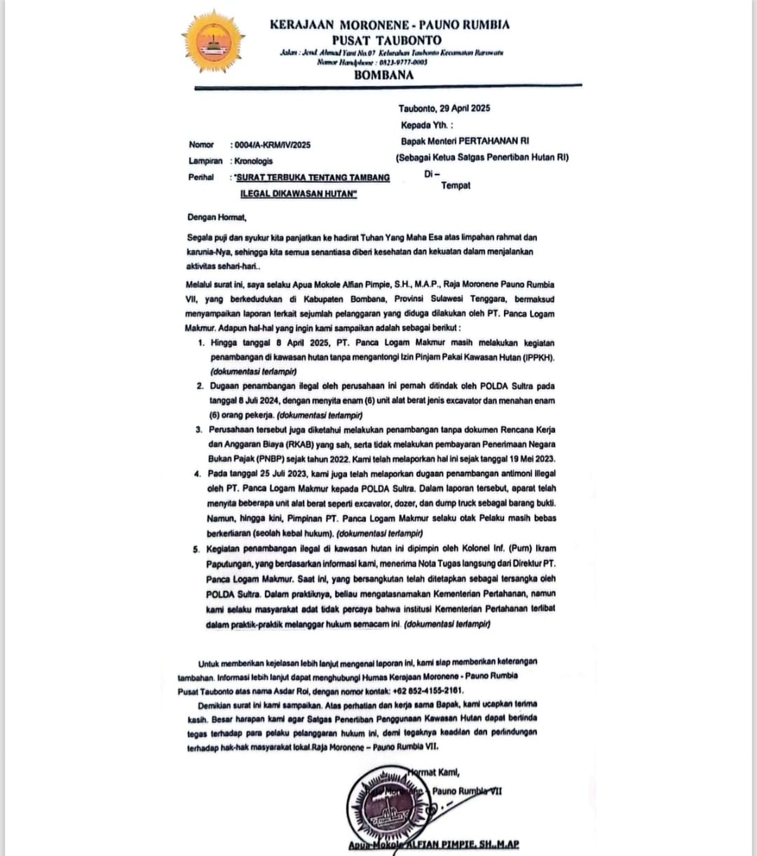 Dalam surat yang dilayangkan, Kerajaan Moronene menyebut bahwa perusahaan tersebut masih aktif melakukan penambangan tepatnya Selasa 8 April tahun 2025 di kawasan hutan tanpa mengantongi izin Persetujuan Penggunaan Kawasan Hutan (PPKH).