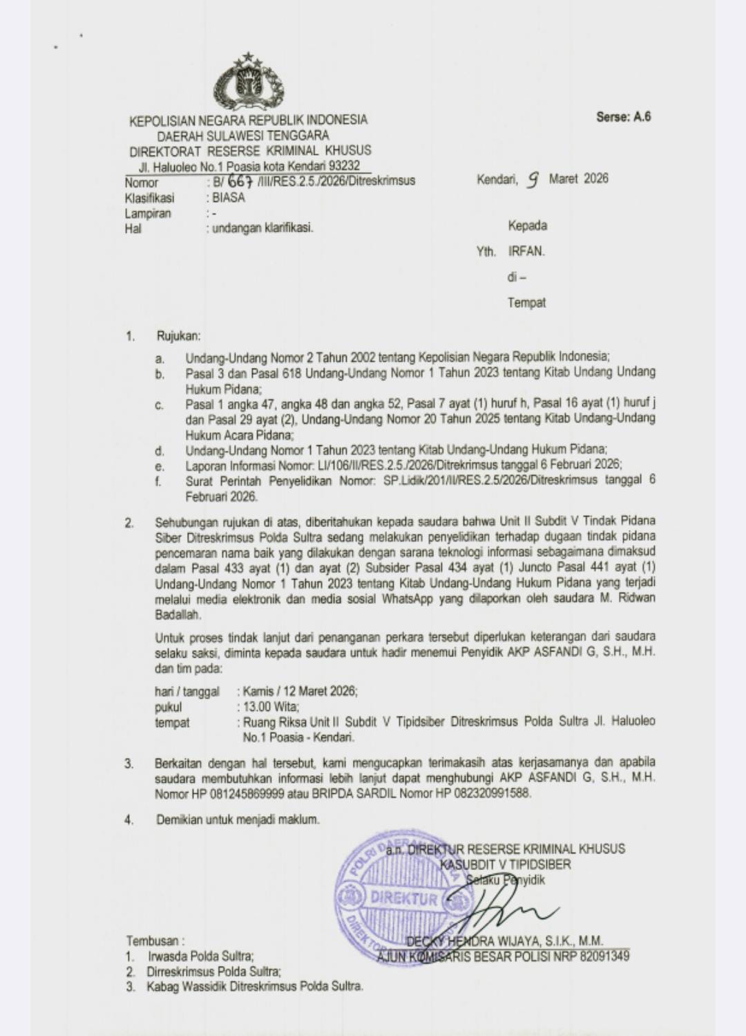 Adi Yaksa Pratama dan Irvan kemudian disurati penyidik Unit II Subdit V Tipidsiber Ditreskrimsus Polda Sultra. Adi yaksa diminta hadir pada 4 Maret dan 14 Maret untuk menjalani pemeriksaan. Sementara Irvan disurati pada 9 Maret 2026 dan diminta hadir dihadapan penyidik pada 12 Maret 2026.