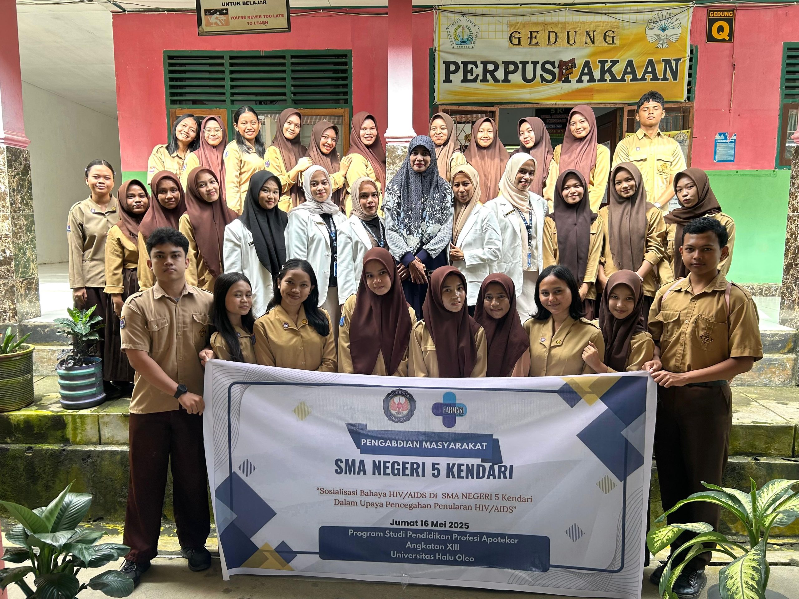 Dalam rangka meningkatkan kesadaran remaja terhadap pentingnya mengenali bahaya HIV/AIDS dan upaya pencegahan penularan HIV/AIDS, para mahasiswa dari Profesi Apoteker dari Universitas Halu Oleo, menggelar kegiatan sosialisasi di SMA Negeri 5 Kendari pada hari Jumat , pukul 08.30 Wita. Kegiatan ini diikuti antusias oleh puluhan siswa siswi kelas XI SMA Negeri 5 Kendari.