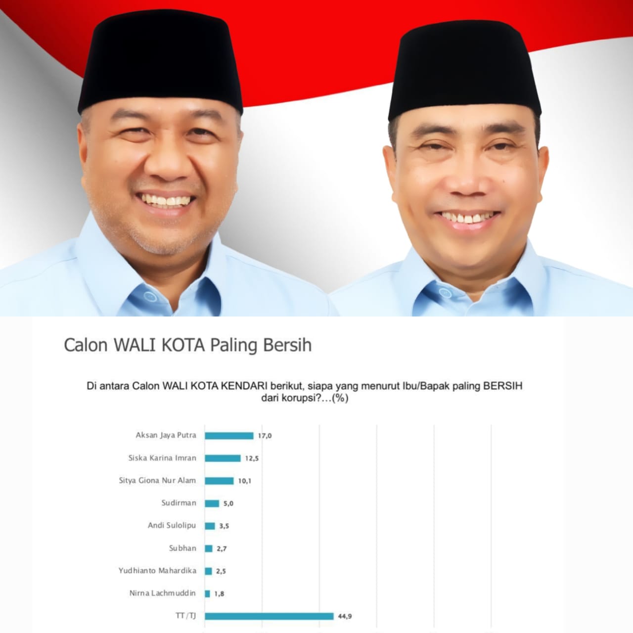 Survei itu juga menggali persepsi publik terkait Calon Wali Kota Kendari yang paling bersih dari korupsi. Hasilnya, AJP berada di posisi teratas atau dinilai paling bersih dari korupsi dengan persentase 17,0.